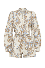 • Vintage textured florals in soft blues and contrast brown on an ivory base