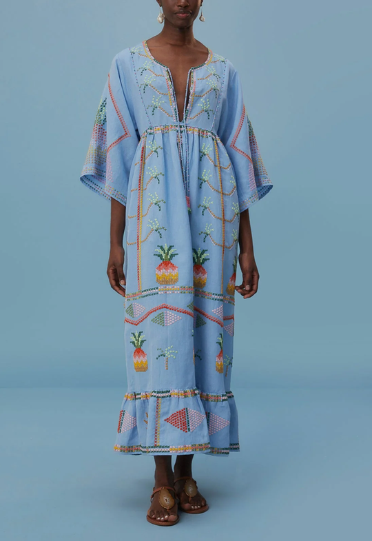 • Elevate your wardrobe this season with this gorgeous blue cover-up adorned with intricate embroidered pineapples, palm trees, and colourful lines. The mid-length bell sleeves and halter neckline with a string tie closure make this the perfect lightweight piece to take you from sunset to late night. Delight in the beauty of summer with this perfect luxury cover-up.