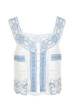 The Embroidered V Neck Tank Top in White/Blue from Love Shack Fancy is the perfect piece for warm days and nights. This wide strap tank top is decorated with gorgeous embroidered eyelet and pintuck details for a truly luxurious look. This ultra-feminine tank top features wide straps, a V neckline, and a scalloped hemline for added elegance. This timeless piece also features a button front closure for easy wearability. Crafted from lightweight viscose fabric, you'll love how light and airy it feels against your skin. Whether you're running errands, brunching with friends, or enjoying an evening out, this sleeveless embroidered top will be sure to turn heads. Show off yours with #StylesBySandDollar