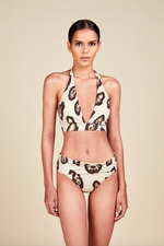 Sultry and unique, the Aguaclara Missy Halter Bikini Top Safari Romantico is perfect for the woman who wants to make a statement. The bold animal print is eye-catching and sure to turn heads, while the elastic band below the bust provides additional support. The removable cups and ties at the back allow you to customize the fit, while the golden metal closure at the back adds a touch of luxury. Fully lined for comfort, this bikini top is sure to become a favourite in your swimwear collection.