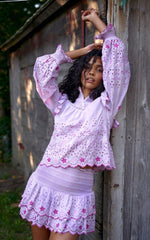 • Relaxed bodice with ruffles tracing the shoulder seams and scalloped trim